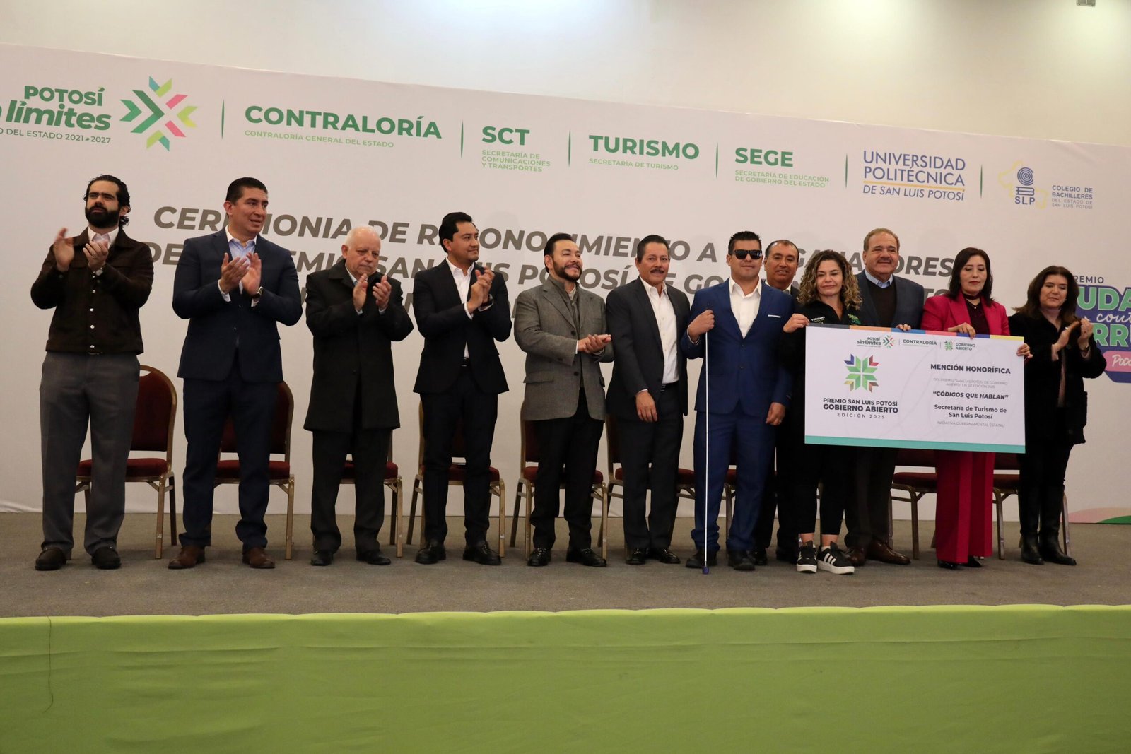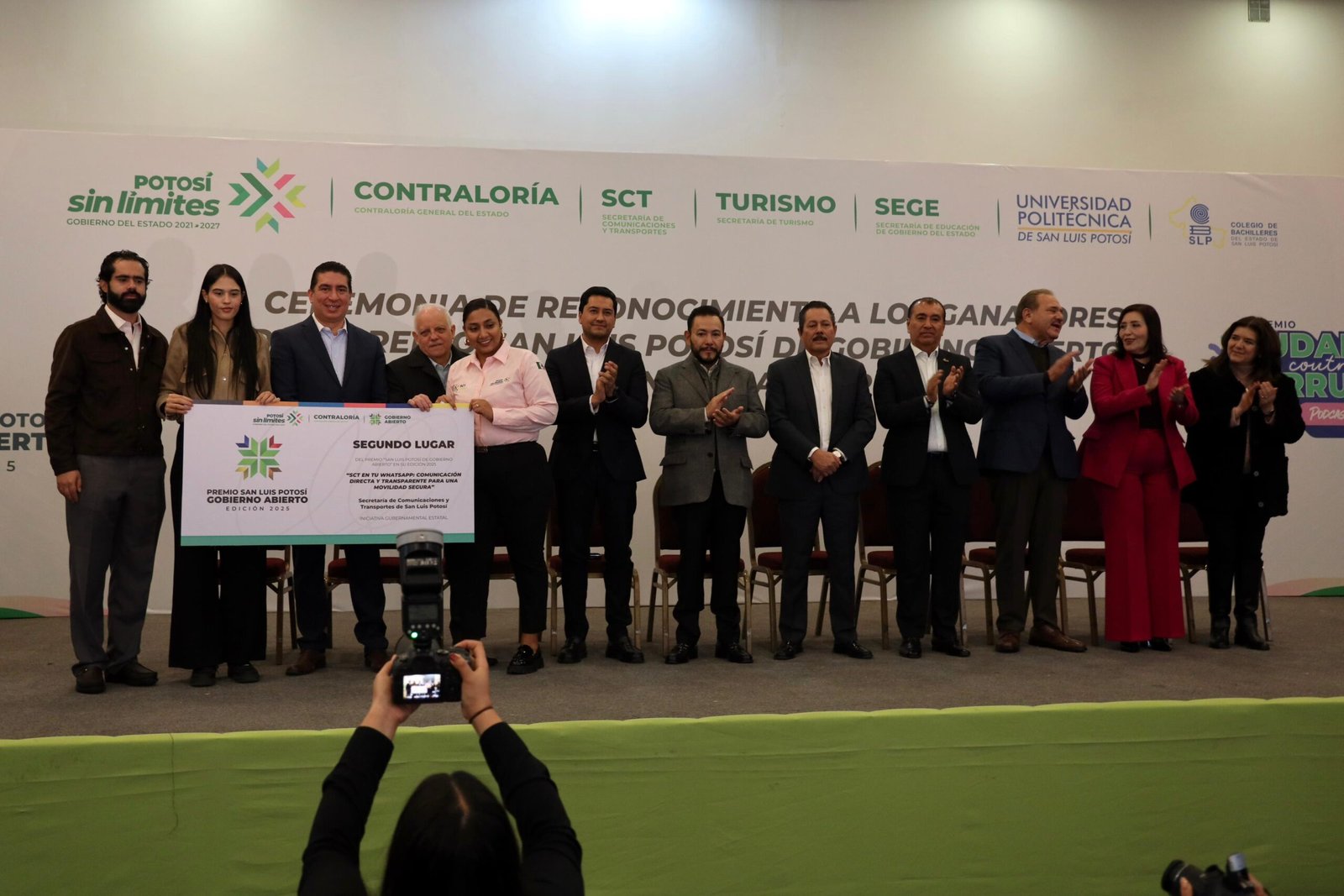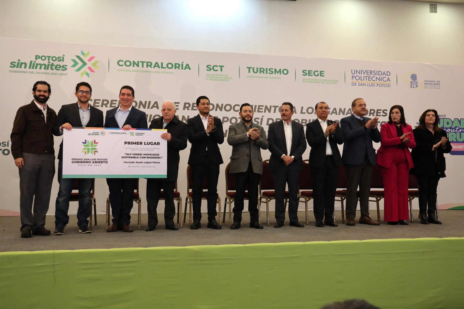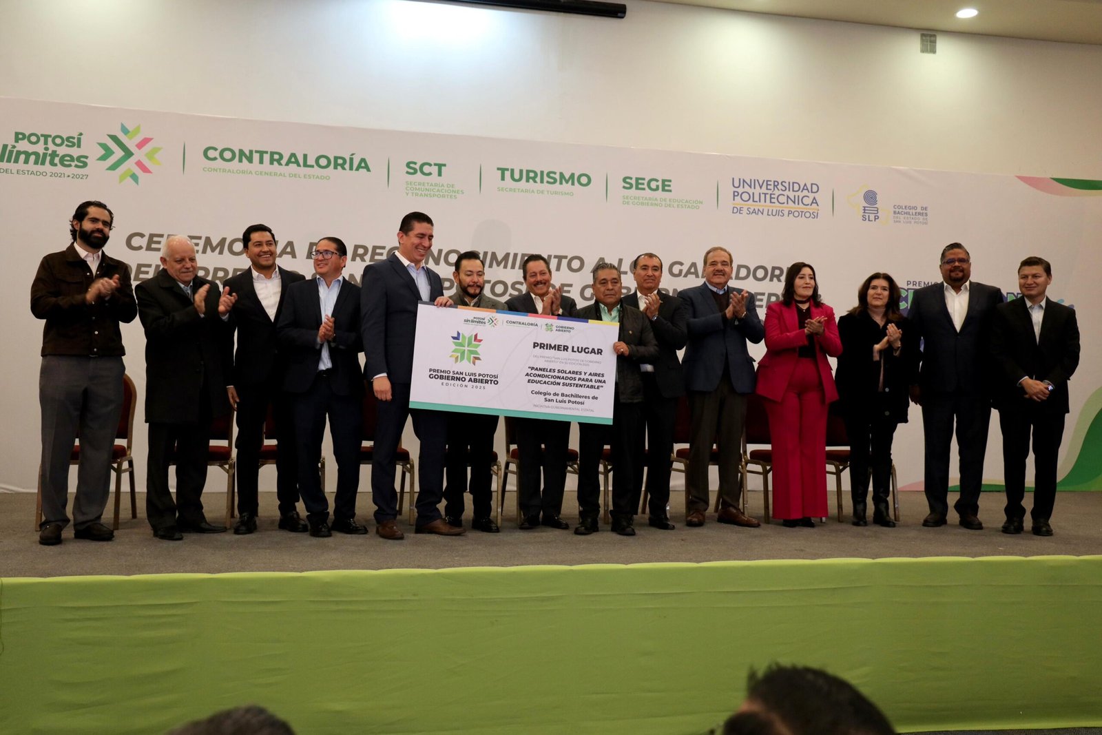 Los ganadores del «Premio San Luis Potosí de Gobierno Abierto» fueron: primer lugar para el Colegio de Bachilleres (Cobach), con su proyecto “Paneles Solares y Aires Acondicionados para una Educación Sustentable”; en segundo lugar, la Secretaría de Comunicaciones y Transportes (SCT) con “SCT en tu Whatsapp: Comunicación Directa y Transparente para una Movilidad Segura” y una Mención Honorífica para la Secretaría de Turismo (Sectur) con el proyecto “Códigos que Hablan”. Además, se llevó a cabo la premiación de la categoría Iniciativas de la Sociedad Civil.
