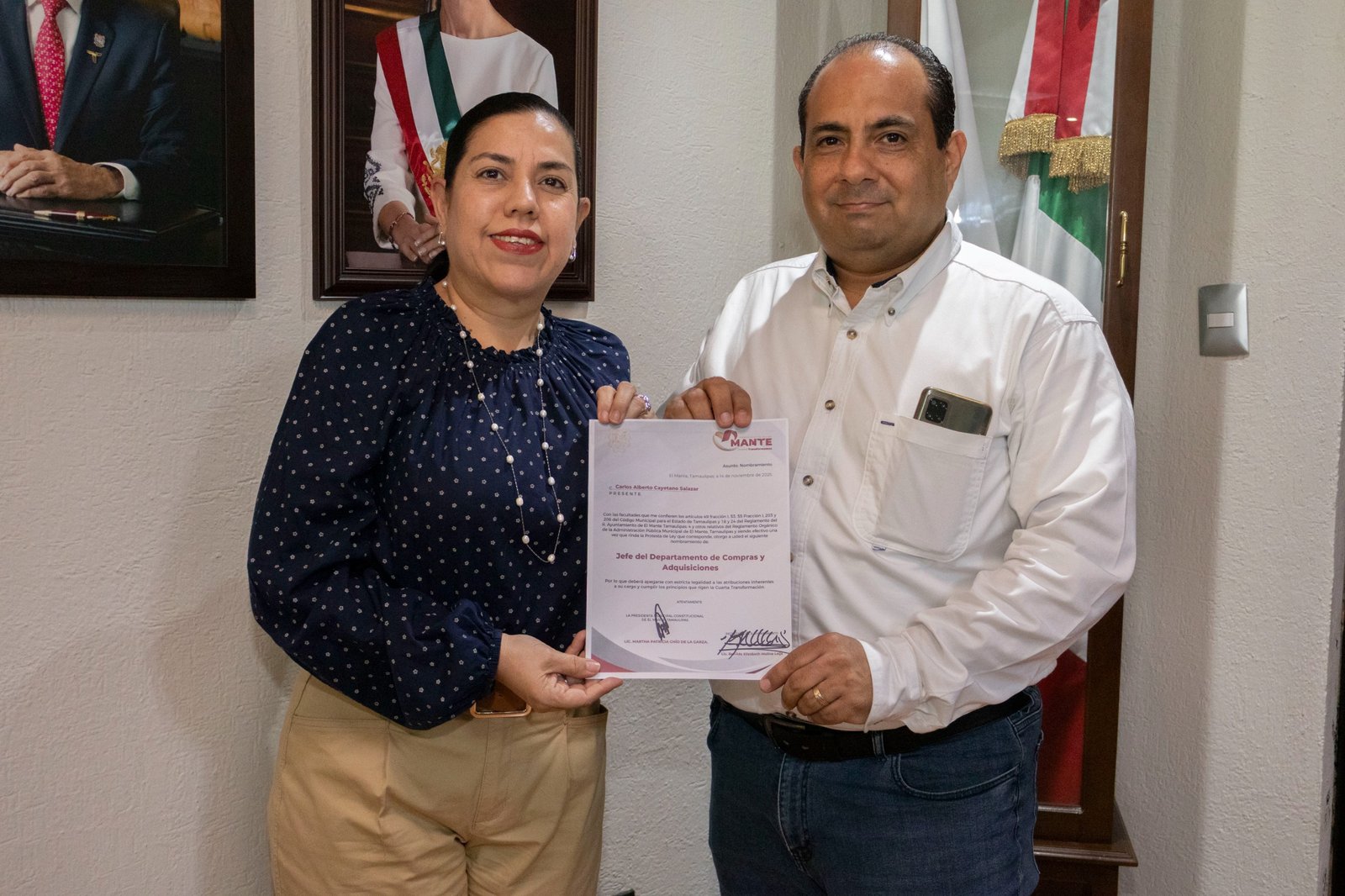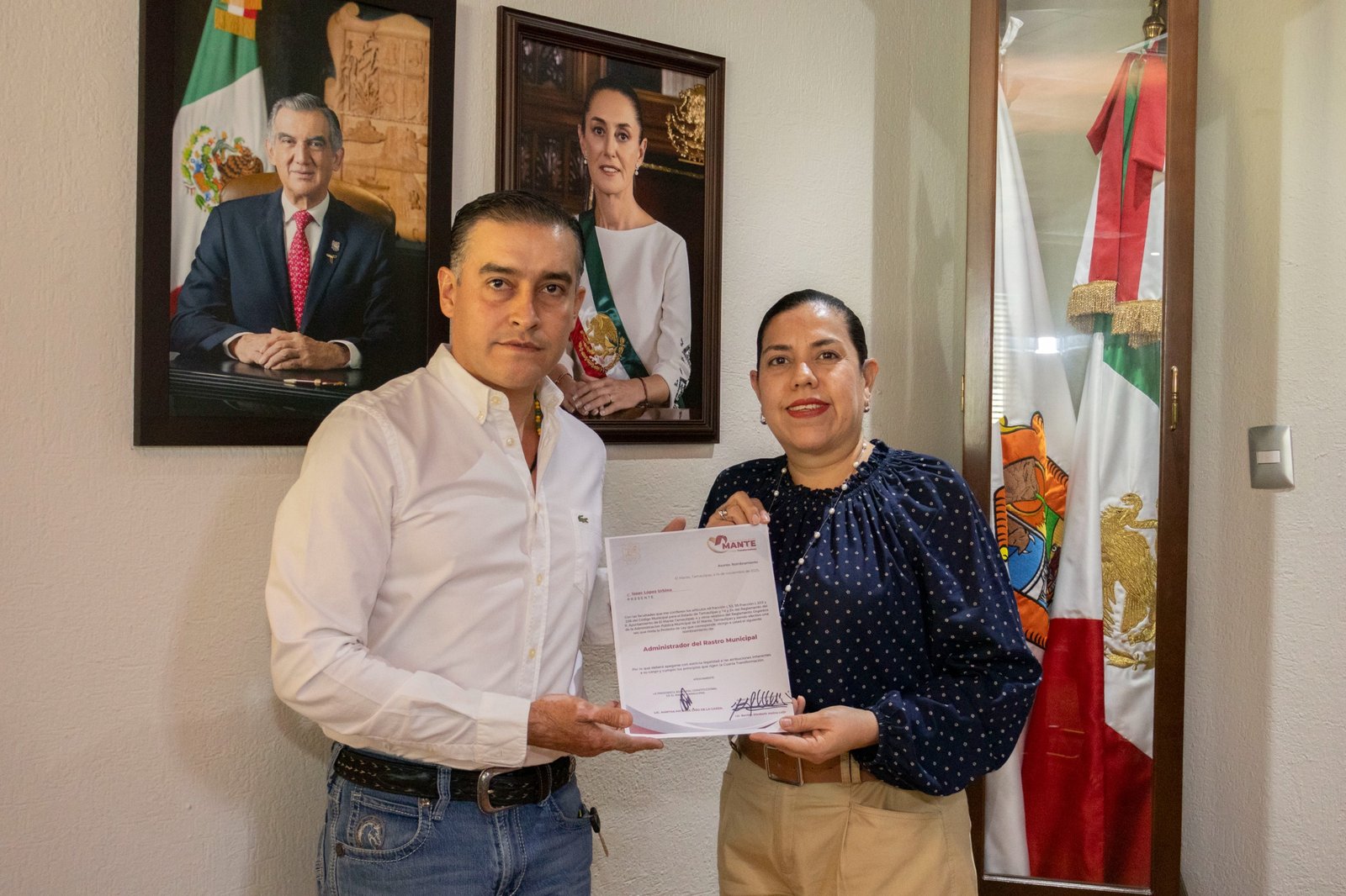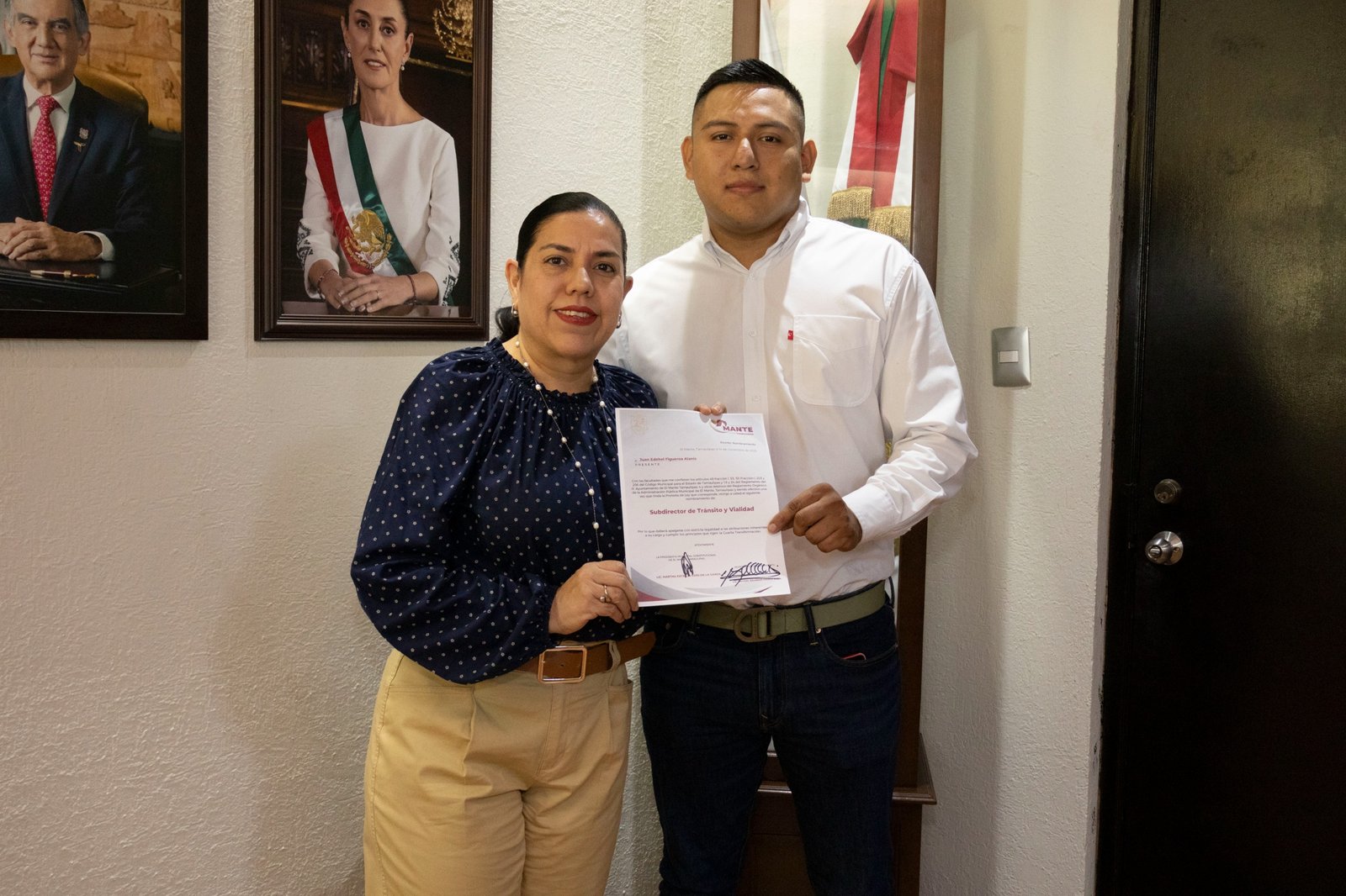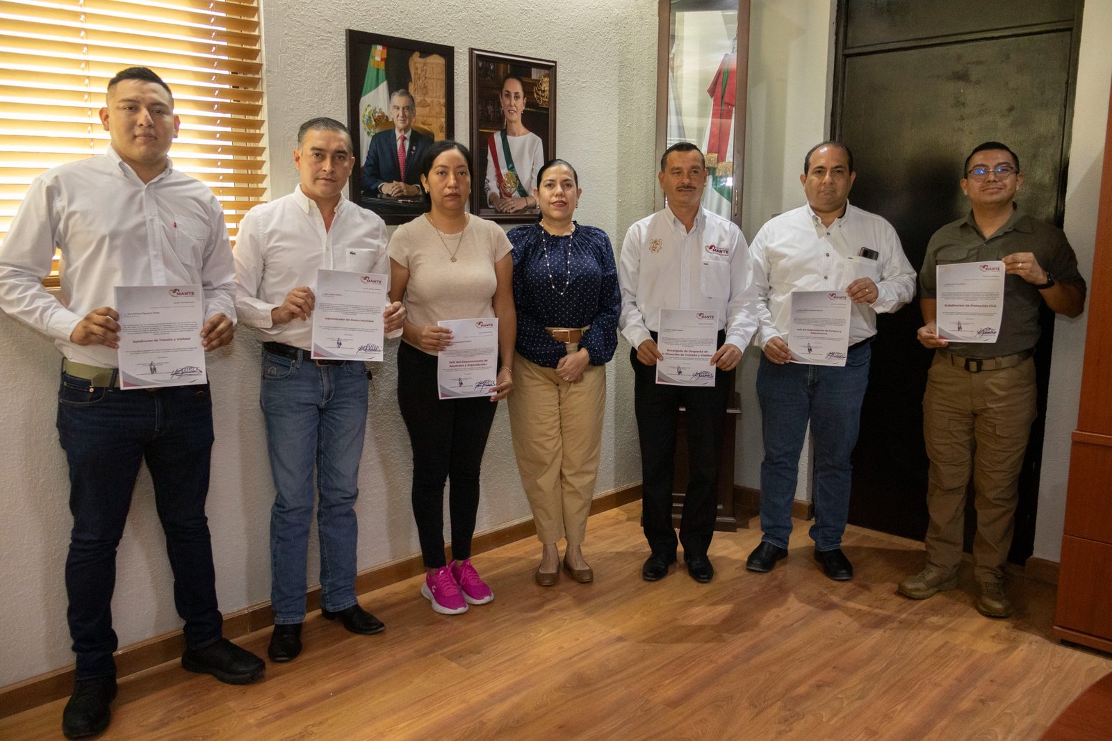 La Presidenta Municipal entregó el cargo de Encargado de Despacho de la Dirección de Tránsito y Vialidad a Jorge Tinajero García; Subdirector de Tránsito y Vialidad, Jorge Edehel Figueroa Alanís; Jefe de Compras y Adquisiciones, Carlos Alberto Cayetano Salazar; Administrador del Rastro Municipal, Isaac López Urbina; Jefa del Departamento de Alcoholes y Espectáculos, María Trinidad Muñoz Chagolla; y Javier Díaz Hernández como Subdirector de Protección Civil.