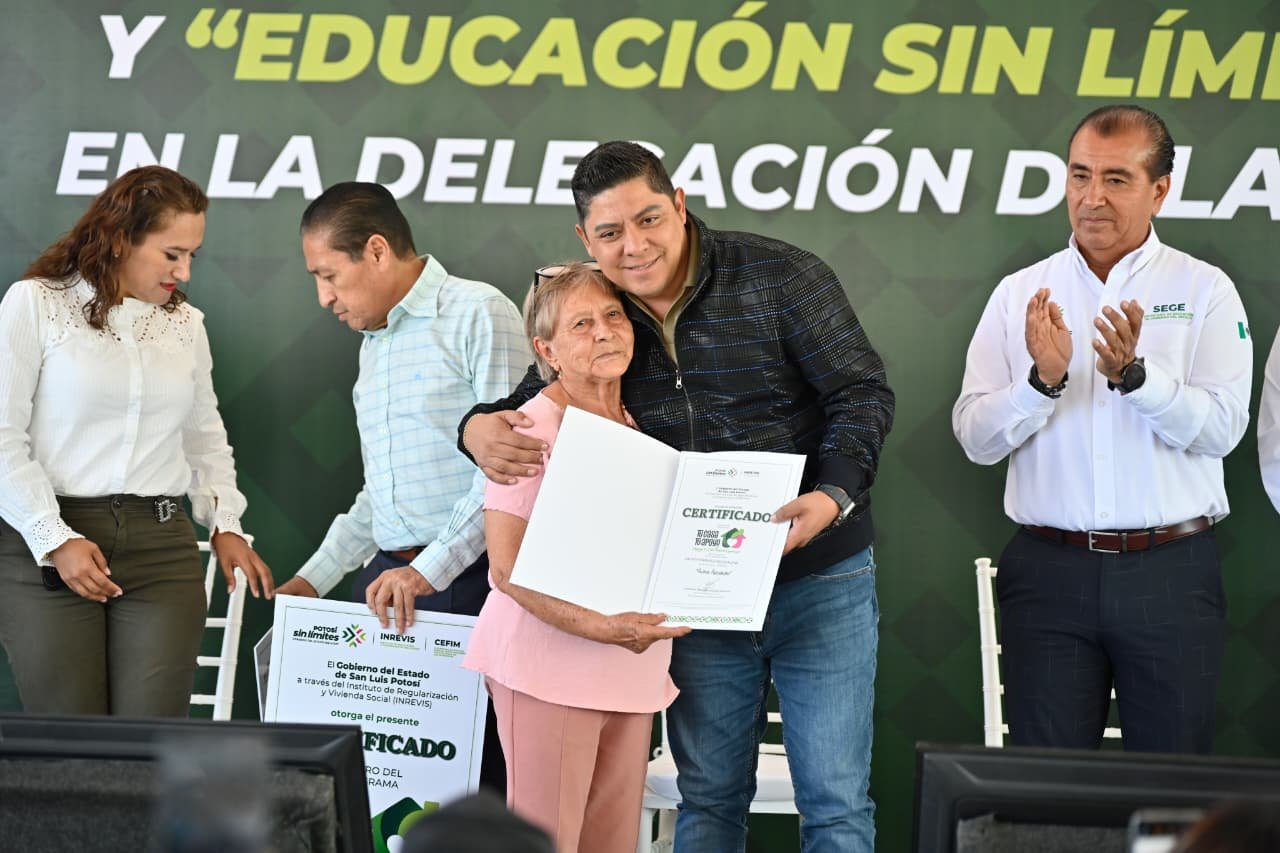 Además de los terrenos gratuitos, el Gobernador Ricardo Gallardo entregó el programa de Educación sin límites en la delegación de La Pila, para niñas y niños, que incluye útiles escolares, mochilas y zapatos, que beneficia a más de 500 mil estudiantes de educación básica de los 59 municipios.