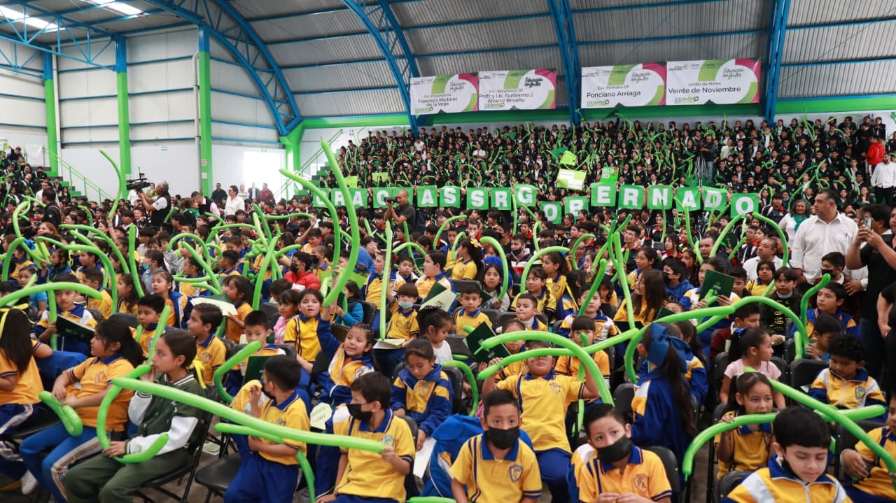 Con el júbilo de la niñez y juventud potosina de la Preparatoria Francisco Martínez de la Vega, la secundaria Profesor y Lic. Guillermo J. Álvarez Briseño, la Primaria Ponciano Arriaga y del Jardín de Niños 20 de Noviembre, el Jefe de Gobierno Estatal dijo que este programa, al igual que los útiles escolares, mochilas, zapatos, uniformes y mochilas sin costo, ayuda directamente a la economía familiar y reduce como nunca la deserción escolar.