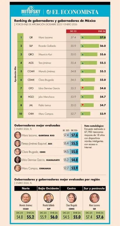 El Gobernador de San Luis Potosí, Ricardo Gallardo Cardona, reafirma su posición entre los líderes mejor evaluados de México al situarse en el segundo lugar nacional del prestigioso Ranking Mitofsky correspondiente al mes de enero.