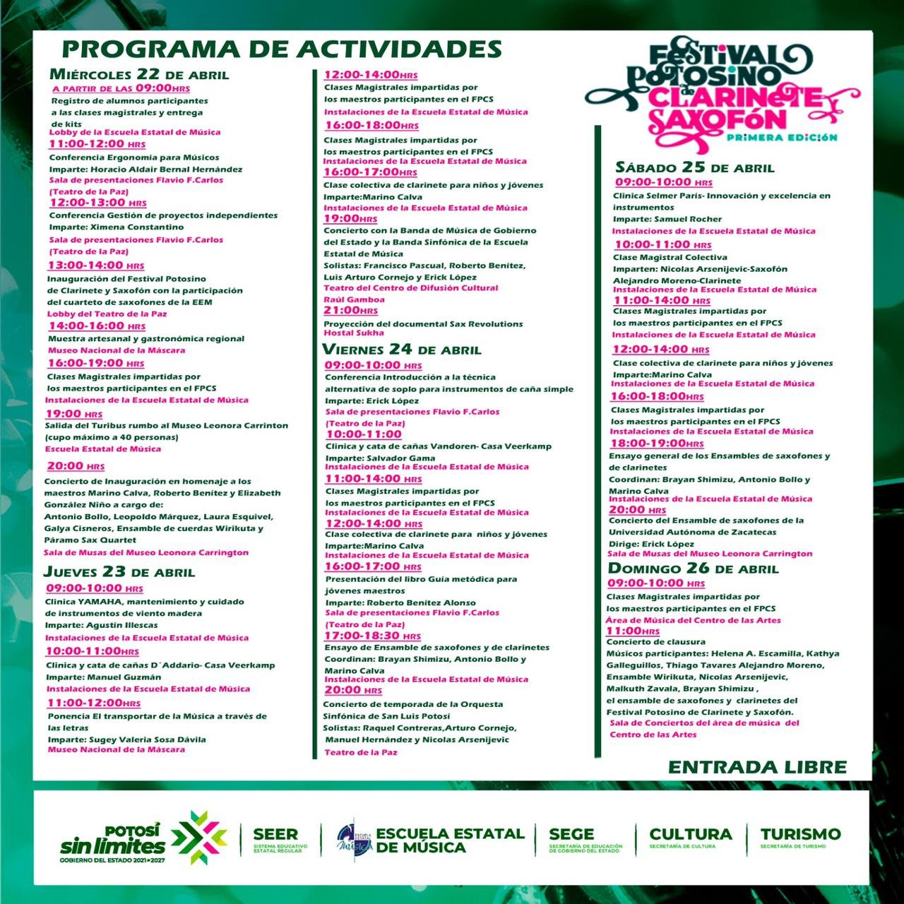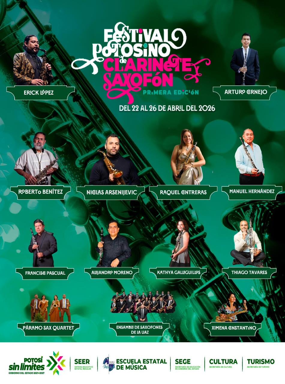 Como parte del impulso del Gobernador Ricardo Gallardo Cardona para acercar más espacios de formación y expresión artística a la población, el Sistema Educativo Estatal Regular (SEER) y la Escuela Estatal de Música presentaron la cartelera del Primer Festival Potosino de Clarinete y Saxofón 2026, que se realizará del 22 al 26 de abril, en coordinación con dependencias estatales, consolidando una oferta cultural sin límites para las y los potosinos.