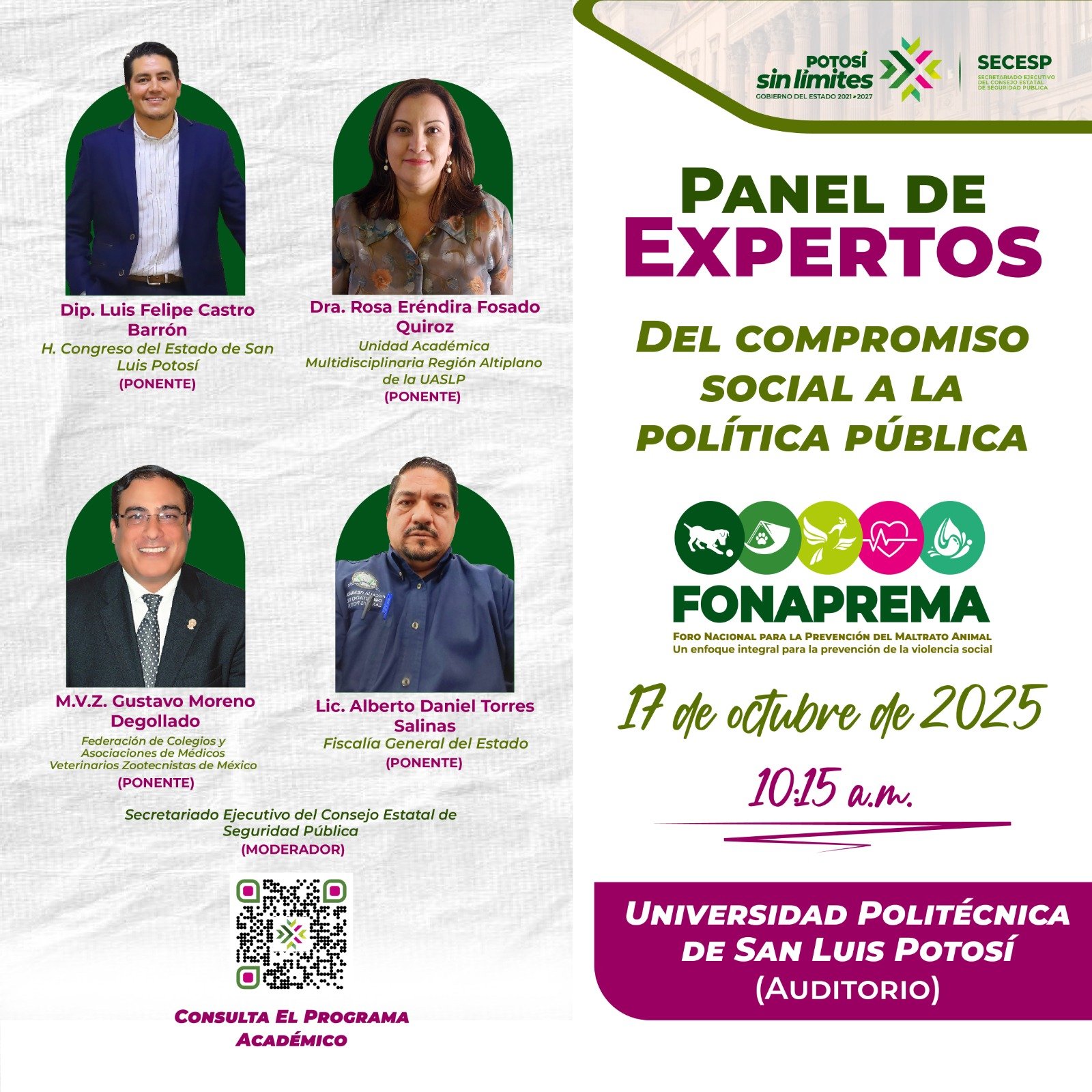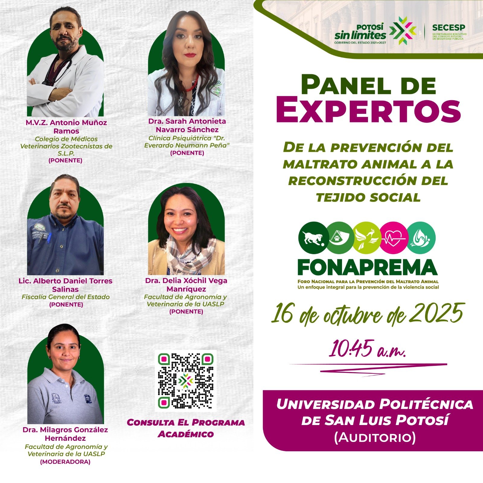 El foro se llevará a cabo los días 16 y 17 de octubre en la Universidad Politécnica de San Luis Potosí, con entrada gratuita y registro previo en http://fonaprema.littsw.com. Participarán expertas y expertos como Lucía Gabriela Rosales, Martín Dávila, Angélica Hernández y Esaú Monsiváis, quienes abordarán temas clave como la salud mental, el enfoque “Una sola salud” y la valoración clínica del animal maltratado.