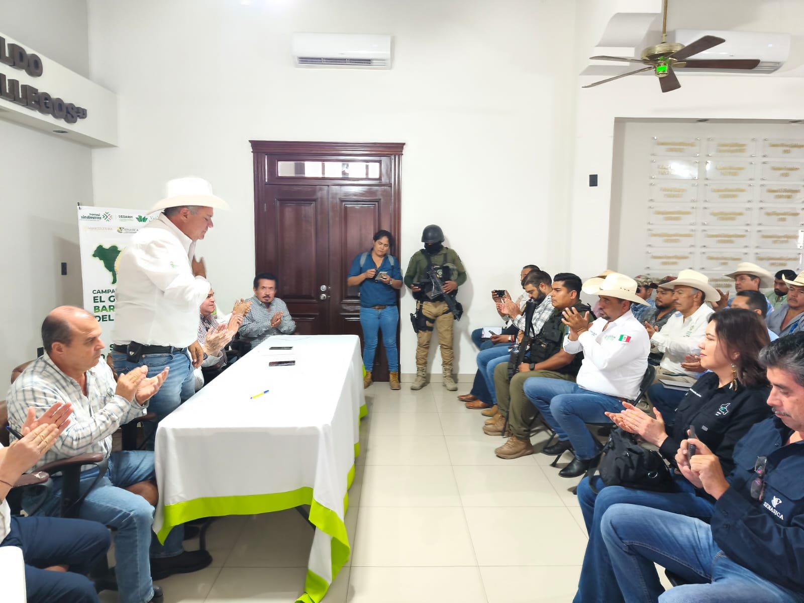 La Secretaría de Desarrollo Agropecuario y Recursos Hidráulicos (Sedarh) recibió a representantes federales para integrar a especialistas, médicos veterinarios y personal comunitario a brigadas para la detección y atención oportuna de nuevos casos. Estas acciones incluyen vigilancia en campo, tratamiento de heridas, aplicación de plaguicidas, instalación de trampas y monitoreo constante, en una labor conjunta que refuerza el cambio que se vive y se siente en la atención sanitaria.