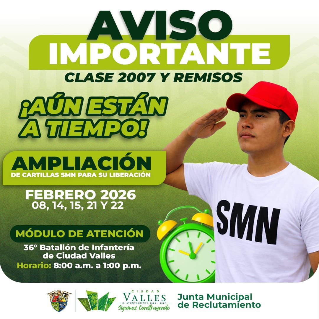 CIUDAD VALLES, S.L.P. – La Junta Municipal de Reclutamiento, del H. Ayuntamiento de Ciudad Valles, informa a los jóvenes de la Clase 2007 y Remisos que ya recogieron su cartilla del Servicio Militar Nacional, y que aún no se han presentado al 36 Batallón de Infantería, que se ha ampliado el plazo para la liberación de sus cartillas, por lo que se les exhorta a quienes aún no han acudido a presentarla a hacerlo a la brevedad.