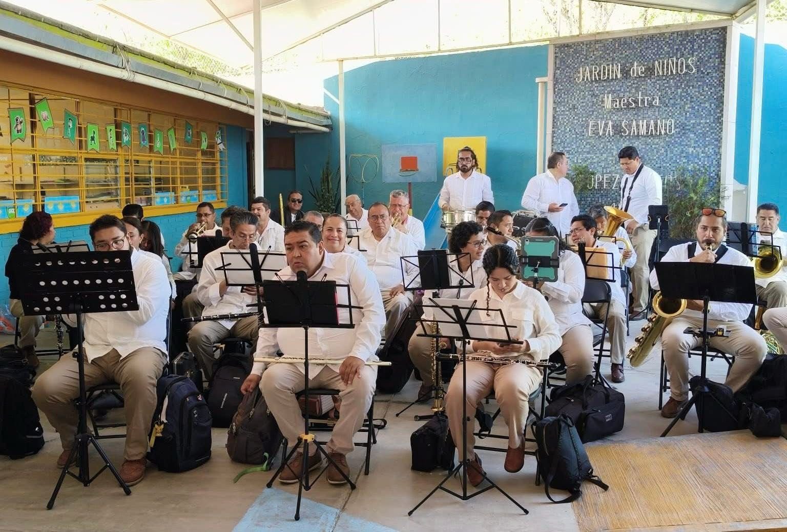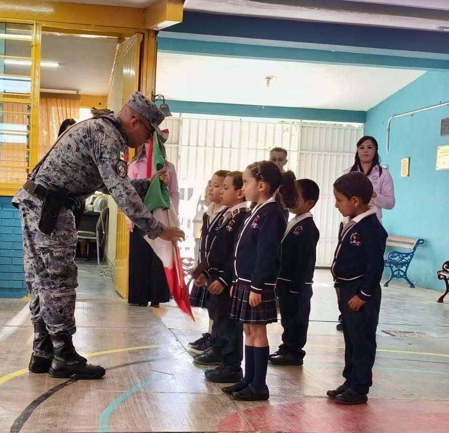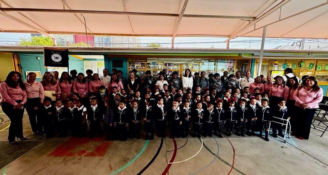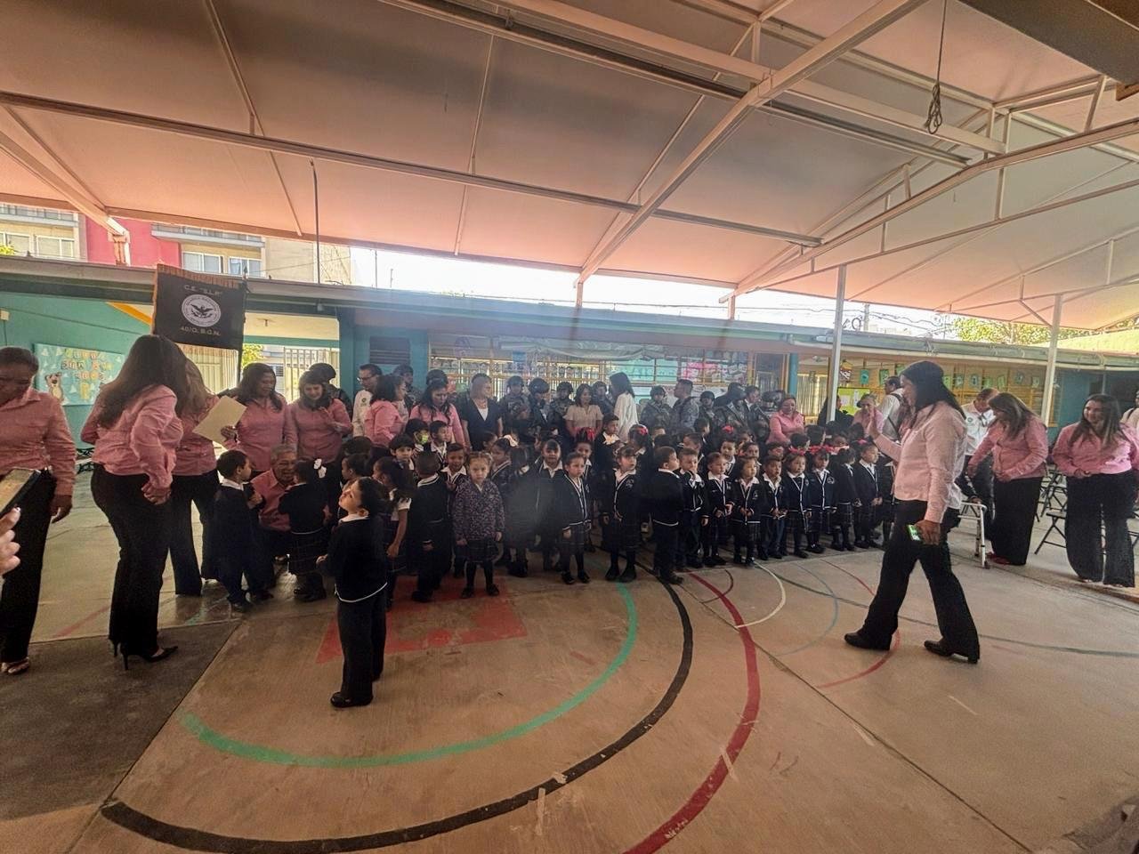 El Sistema Educativo Estatal Regular (SEER) reconoce al personal docente de nivel preescolar por su compromiso en la formación de valores en los niños durante los honores a la bandera en el jardín de niños Eva Sámano de López Mateos, en una ceremonia acompañada por la Guardia Civil Estatal y la Banda de Música del Gobierno del Estado.