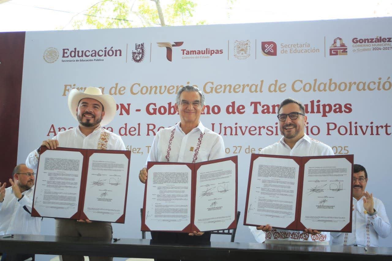 González, Tamaulipas. – El gobernador Américo Villarreal Anaya firmó el convenio de colaboración con el Instituto Politécnico Nacional e inauguró el Recinto Universitario Polivirtual, una nueva plataforma académica con la calidad y la excelencia educativa que distingue a esta prestigiada institución y que, por primera vez, se pone en marcha en todo el país.